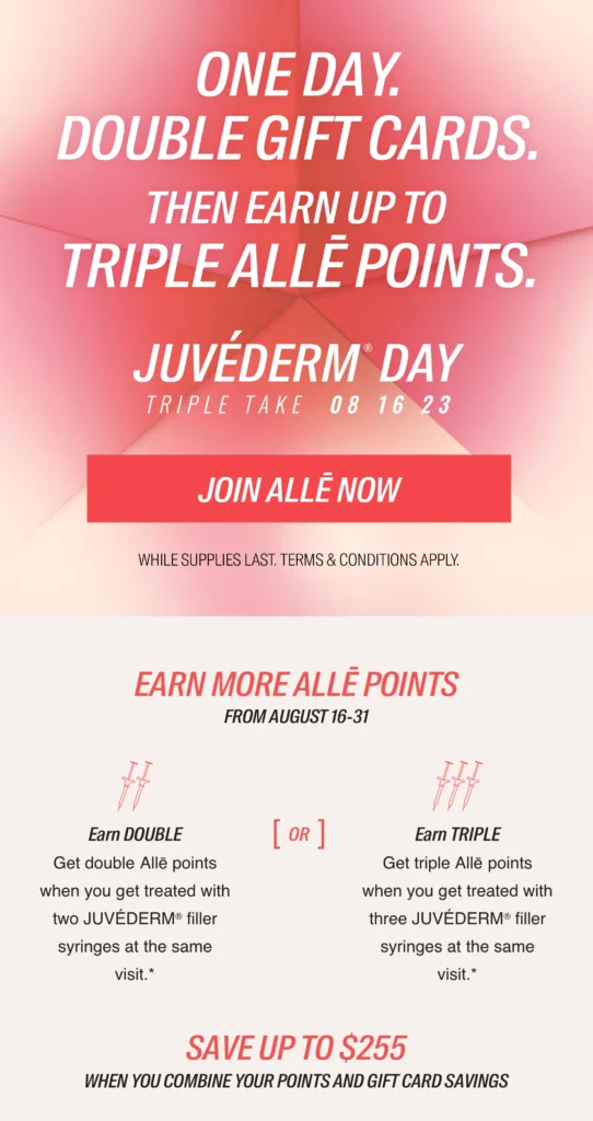 We’d like to remind our patients to join the Allē rewards program. When you visit us, you will accumulate points on your treatments. You can earn points from Non Allergan treatments as well! The points are then deposited into your Allē account; upon checkout, the available points are redeemable toward your Allergan treatment such as Botox, Juvederm, Coolsculpting, Diamond Glow – saving you money! Every 100 points you earn saves you $10 off your treatment. Purchasing Allergan products and treatments earn you the most points.